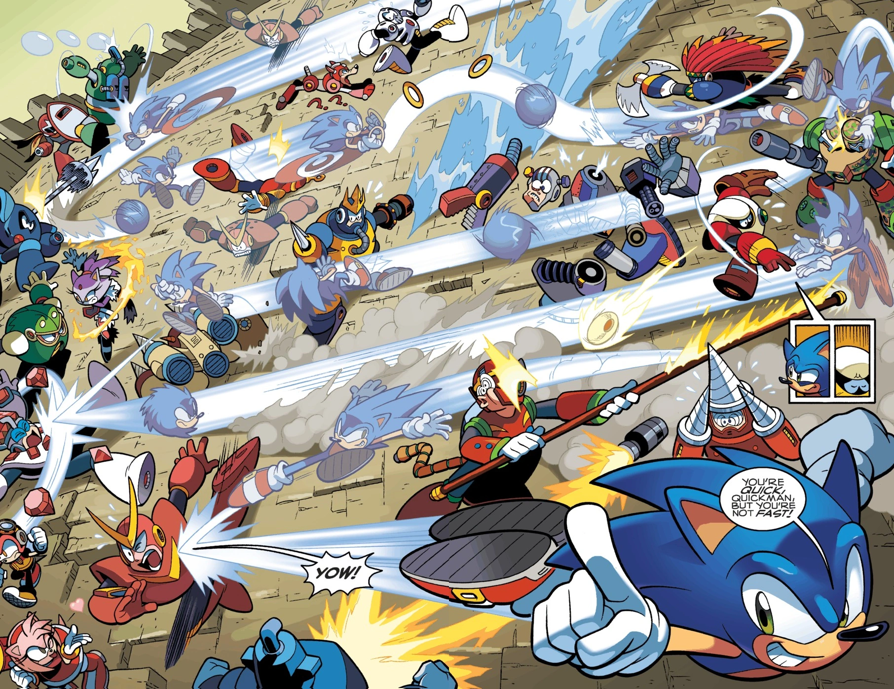 Meanwhile, Sonic is left to face Quick Man, Charge Man, Slash Man, Metal Man, Turbo Man, and Nitro Man. Quick Man comments how Sonic is a better opponent to face than Mega Man, but Sonic uses his speed and Spin Dash to make short work of the speed-orientated Robot Masters and tells Quick Man that even though Mega Man does not have his speed, none of the superfast rust buckets have his skill. Mega Man then uses the Piko Hammer against Blade Man and Sword Man, but he quickly changes into the Fire Tornado Master Weapon to take down Blizzard Man, Commando Man, and Jewel Man. Mega Man then uses the Sonic Shot on Rouge Woman while Sonic drags her down, and it turns Rouge back to normal while Mega Man collects the Black Wave Special Weapon, making his weapon collection an even ten. Sonic then takes down Bubble Man, Needle Man, Ring Man (which makes Sonic look at the Rings he collected from the Robot Master), Tomahawk Man, Search Man, Junk Man, Wave Man, Ground Man, Jewel Man, Strike Man (in which Sonic stared at the Robot Master with a confused look), Buster Rod G, Drill Man, and finally kicked Quick Man, as Sonic replied that although Quick Man is quick, he is not "fast" like himself.