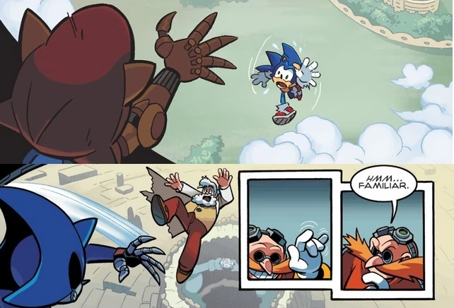 The difference between the two panels are Sonic replaces Dr. Light on the top as Metal Sonic throws the doctor off instead. Notice how similar the panels are.
