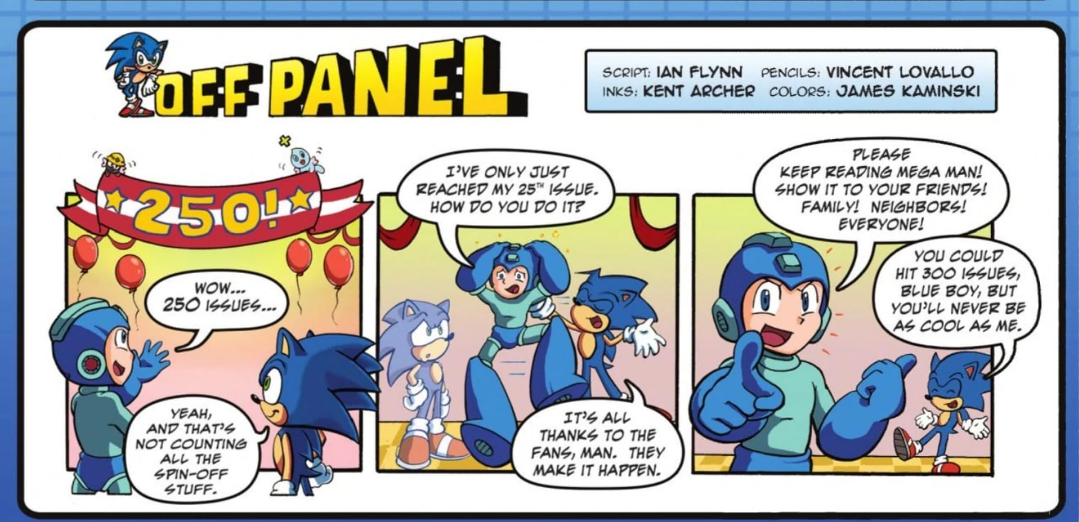 Mega Man joins Sonic at a party celebrating the issue and marvels over how Sonic's comic has reached 250 issues-not counting various spinoffs. Having only reached his 25th issue recently, Mega Man asks Sonic how he's done it, and Sonic responds "It's all thanks to the fans." Mega Man then launches into a classic comic ad, telling everyone to keep or start reading his series, while Sonic remarks that Mega Man still won't be as cool as he is even if he reaches 300 issues.