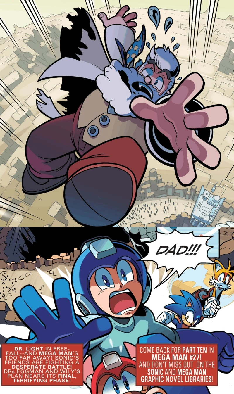 Inside the Wily Egg, Dr. Light has made a transmitter to contact Rouge, Mega Man, Proto Man or even Duo out of the spare parts from the Motobug and Met in his cell, but without any success. Suddenly, however, Eggman and Metal Sonic find Dr. Light contacting for help. Eggman praises Light's resourcefulness, saying that he was wondering how Rouge knew exactly where to strike to disable the Wily Egg's engines and vent their Chaos energy. He initially thought it was Rouge's own resourcefulness, but the big tell was Light somehow knowing all about their master plan. He asks Metal Sonic to bring the good doctor and he obeys, dragging him over to a huge drop shaft that Eggman opens with the press of a button that opens a drop hatch. Dr. Light tries reasoning with Eggman, telling him that he does not need to do this, but Eggman replies that he wants to all the same. Metal Sonic throws Thomas out of the drop shaft, causing him to plummet to the ground below. Eggman waves to Thomas, and remarks that the scene seems familiar. Meanwhile, Rush quickly takes notice of this and barks at Mega Man, the Blue Bomber soon realizing what is about to happen to his father. The issue ends with Mega Man calling out to his father.