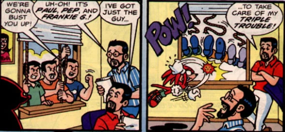Frank Gagliardo appears alongside Joe Pepitone and Paul Castiglia to get revenge on Freddy Mendez and Scott Fulop. Scott uses his editorial powers to call upon Knuckles to smack them out of the way, taking care of his "Triple Trouble".