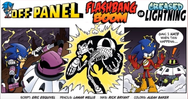 As Sonic tussles with E-118 Tau, Sonic is struck by lightning, giving him a familiar lightning bolt-laden red costume. Sonic gripes that he hates it when this happens.