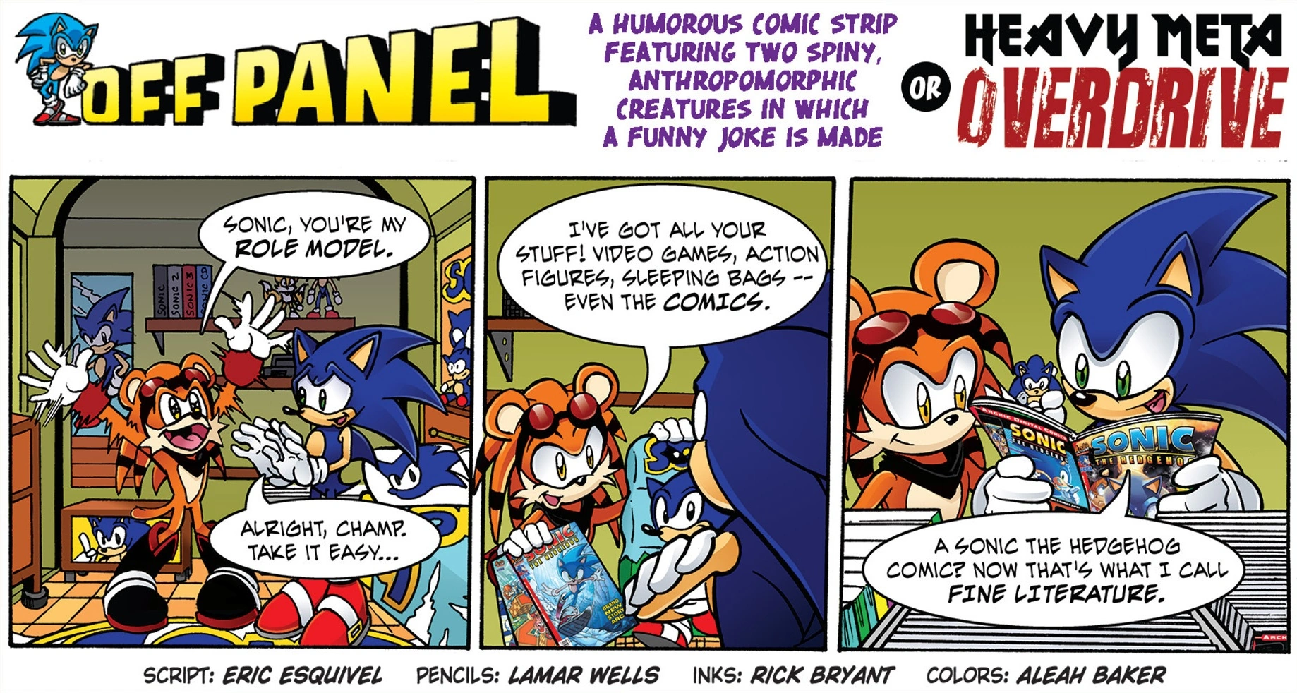 While in Spike's room, Spike exclaims how Sonic is his role-model which makes Sonic ask him to calm down. Spike tells him of his complete collection of Sonic merchandise, including his comics. Interested, Sonic looks at the comic (specifically the current issue) and calls it 'fine literature'.