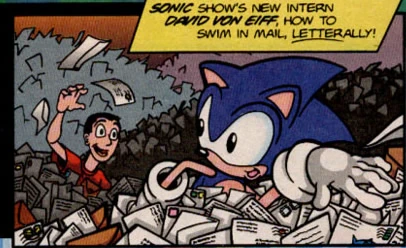 Sonic and a young man swim through a sea of letters with the following caption: "Sonic shows new intern David Von Eiff how to swim in mail, letterally!"
