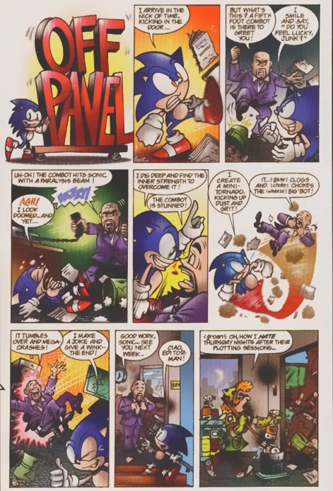 Sonic and J. F. Gabrie plot an issue by engaging in a made-up battle involving a fifty-foot Combot. They destroy objects and mess up the office while acting out the fight. A cleaner later comes by ready to clean Gabrie's office, expressing her hate for when Sonic and Gabrie engage in their Thursday night plotting sessions.