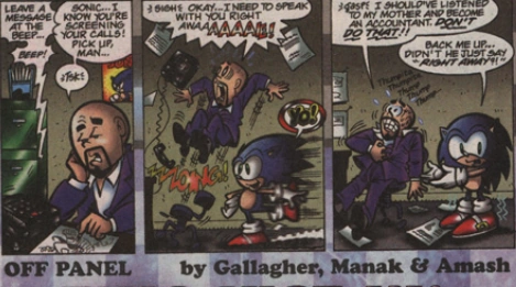 The editor calls Sonic and leaves a message accusing him of screening his calls. He demands that Sonic come see him right away. Sonic arrives just as he finishes his sentence, loudly greeting him. The editor has a heart attack and Sonic asks the audience if they can back him up on the fact that the editor asked for him to come "right away."