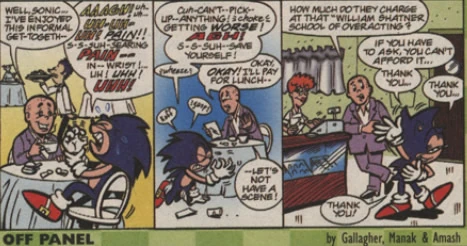 Sonic and J. F. Mendez-Gabrie are finishing up lunch when Sonic suddenly starts dramatically complaining about a fierce pain in his wrist. As Sonic tumbles to the floor melodramatically, J. F. Mendez-Gabrie tells him he will pay the bill. After the bill is paid, he asks Sonic how much it costs to learn from the "William Shatner School of Overacting" and Sonic takes a bow.