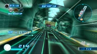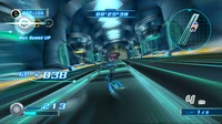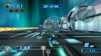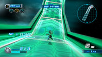 Just before each sharp turn the rider may attempt to jump off the edge and use Gravity Control to access the floating wall as a Wall Route. As the player progresses through the course, the side glass walls of the course will shatter, allowing the player to use Gravity Control to cross over the gap as a shortcut. When using the Gravity Dive , large green prism-shaped crates can rise up from the ground which the player may use as Meteor Bursts.