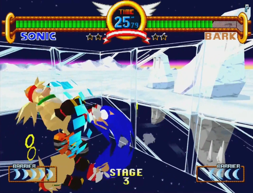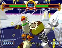 Aurora Icefield is set in a frozen area. The arena is surrounded by giant ice blocks, instead of boxing ropes or similar walls like in the other previous levels. Bark the Polar Bear is the opponent for this level, once you have defeated him, you will receive a Yellow Chaos Emerald, and you will proceed to the next round. If the player is controlling Bark, Dr. Robotnik comes to the arena in an Egg Mobile and creates a colorless clone of Bark that the player will have to defeat.