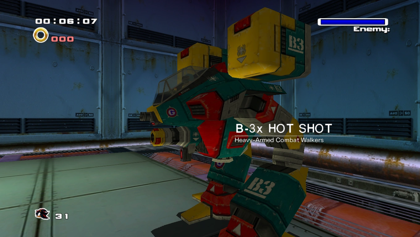 Hot Shot begins the fight by taking to the air and flying in a circular path around the area. Hot Shot is capable of releasing gunfire during flight which can damage Shadow, even when he is using the Spin Dash. When Hot Shot lands, it normally fires missiles from the modules on its shoulders. After launching the missiles, Hot Shot is vulnerable and completely open to attacks. Hot Shot also possesses a charge shot which takes approximately five seconds to charge (nearing the corners). It uses a reticle to aim at Shadow, and thus can be avoided by paying attention to the location of the reticle. When landing a successful third hit on it, he will charge up its shots and increase its numbers. Four hits are required to defeat it.