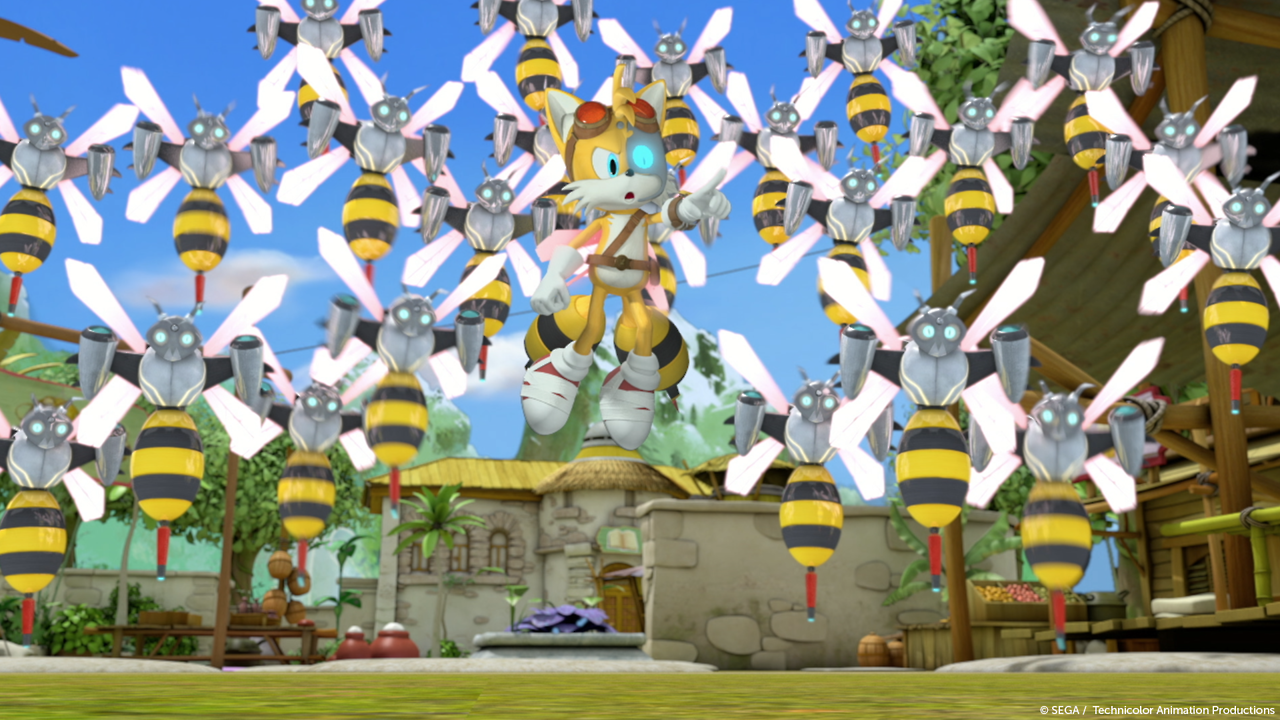 Before going to the Villain Retreat, Eggman programmed his Bee Bots to attack Team Sonic on sight, which annoyed the team to no end. Unable to make Orbot and Cubot call off the Bee Bots with Eggman gone, Team Sonic trapped the Bee Bots in a cave. However, a straggler Bee Bot joined Tails when he tested his Matter Transporter on himself, which caused them to be merged into a cyborg. Corrupted by the Bee Network, Tails freed the Bee Bots and took control of them to attack Team Sonic, who fell back when they saw that destroying Bee Bots hurt Tails. Sonic later drew Tails and the Bee Bots out, and Team Sonic managed to subdue Tails and separate him from his Bee Bot half (which Sticks promptly smashed).[50] The Bee Bots soon after met up with Eggman after he stole Bolts' intelligence chip. When Team Sonic, Mighton and Cyborg Sonic fought Eggman for the chip however, it ended up in a Bee Bot. Although it benefitted from the chip, the Bee Bot passed it onto another Badnik before it got smashed by the heroes. This continued until Eggman surrendered the chip after it ended up in Mombot.[51]