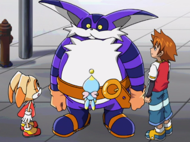 Big the Cat (ビッグ ・ザ ・キャット Biggu za Kyatto?) is a character that appears in the anime series Sonic X and its comic series published by Archie Comics. He is a large anthropomorphic cat from Sonic's world who got sent to Earth for a time due to Chaos Control. Despite his size, Big is gentle and kind but not the sharpest tool in the shed. He spends most of his time fishing and relaxing with his best friend, Froggy.