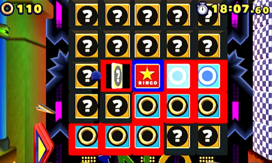 Bingo is a game that typically uses nine numbers (from 1 to 9). If the player manages to collect three of these numbers found within a playable level so they align in a row either horizontally, vertically or diagonally on the Bingo grids that are depicted prominently within the level, they will get a "bingo", and will usually be rewarded with Rings. After this, the grids that showcase the bingo will restart.