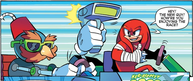 For Dr. Eggman's scheme to collect the bio-data of Team Sonic during the Go-kart Pan-island Grand Prix, he created Bomb Driver to take out Sonic during the race. Participating in the Grand Prix as a mystery racer, Bomb Driver stuck close to its creator for the majority of the race, until Eggman ordered it to go after Sonic. However, when it passed Knuckles, it ignored him when he tried to talk to it. This enraged Knuckles enough to punch it, making Bomb Driver detonate prematurely, though it still took Knuckles out of the race.[1]