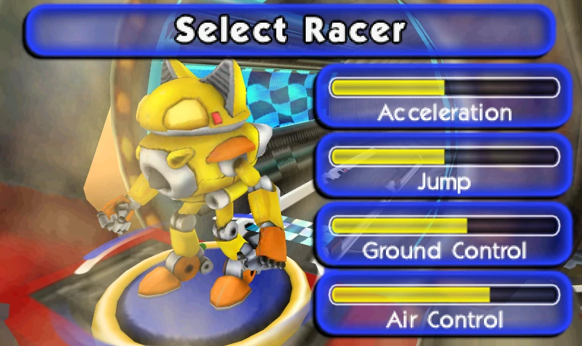 In gameplay, the Bot Racers all share the same basic moves, which includes the Air Dash, Double Jump, Fire Mode, Homing Attack, Ice Mode, Sprint and usage of the Enerbeam. However, they have no actions exclusive to themselves. On the other hand, the Bot Racers each have their own statistics which determine how well they perform in gameplay. The higher the statistics, the better the performance.