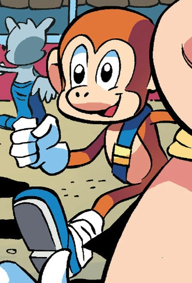 A fan of Tommy Thunder, the Child Monkey came to the movie star's latest movie promotion. Although he fled when Dr. Eggman attacked, he returned to hail Team Sonic's victory over Eggman. The Child Monkey also showed up to hail Tommy after he "beat" Obliterator Bot.[31] After watching the opening of the new scissor factory, the Child Monkey would come to see Sticks' interviews after she got a popular TV news gig. As Sticks admitted she had sold herself out to the media though, the Child Monkey was inspired by the repentant Sticks to "fight the power." He and the villagers thus began a random revolt before getting calmed and directed into destroying Eggman's latest device when he showed it.[32]