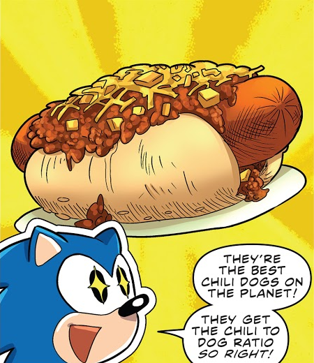 In the Sonic the Hedgehog television series, chili dogs are prominently featured as Sonic the Hedgehog 's favorite food. It is also one of the few foods being served in Robotropolis .