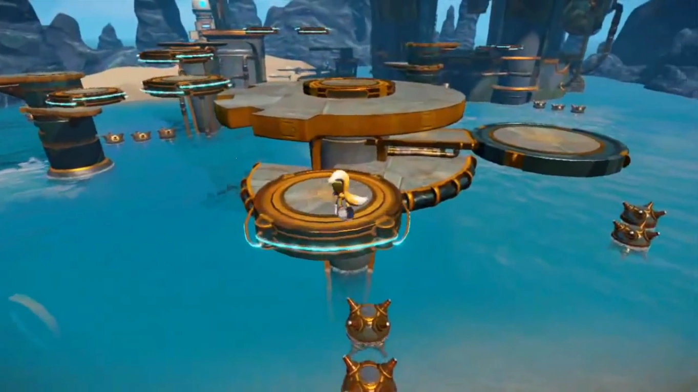 Leading from dry land are small metal platforms, which are either floating and held up by pillars (the former flip around in intervals). These platforms are the only path to the tower-like platform. Additionally, the waters of Coral Bay are infested with mines.