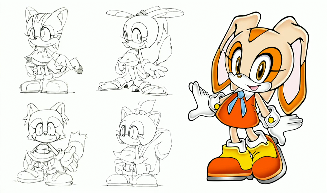 Like Sonic and Silver, Cream had several early concepts as different kinds of animals. They appear to include a squirrel, cat, and raccoon. It's likely that some aspects of these designs were reused for later characters like Marine the Raccoon and Sticks the Badger. Cream's name is a pun of the foods "vanilla cream" and "cream cheese" which underlines her relationships with Cheese and Vanilla the Rabbit.[6]