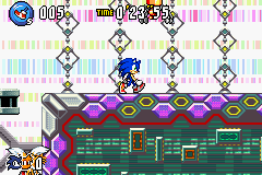 Like Egg Utopia, Cyber Track has gravity shifts that occur by themselves. These are often indicated by arrows on the "wall" pointing up or down. Like many other levels in Sonic Advance 3, this level is abundant with bottomless pits which makes the highest route often the safest, though it is possible to fall off the top of the screen due to the reversed gravity.