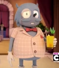 The Warehouse Worker is an anthropomorphic ox of average height with arylide yellow fur and magenta eyes. He has a slightly large and round torso and head, relatively thin arms, a bushy tail and slightly stubby legs. He also has cornsilk skin on his front torso and wide muzzle, a medium-sized black snout, almost cylinder-like ears, a pair of short white horns with black tips and a small brown goatee. For attire, he wears an iris cap with round edges, white gloves, a shirt colored in a mix of iris and light purple with a nametag and eye-like spots, large green baggy socks and red shoes.