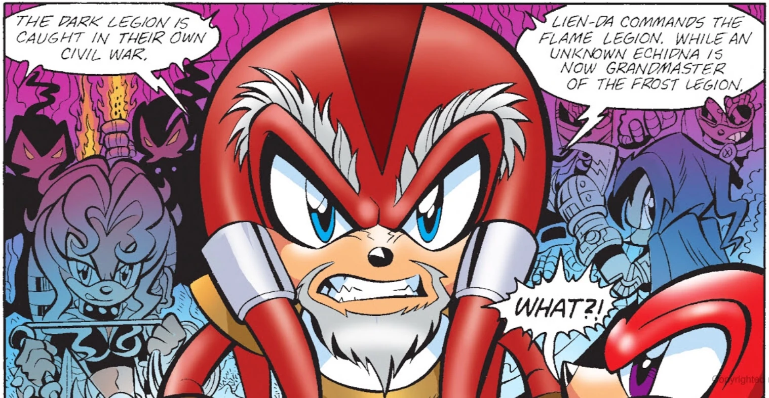 While in the Chaos Chamber, Remington and Lien-Da were shocked when they discovered Finitevus's betrayal by allowing only Knuckles the Echidna to absorb the power of the Master Emerald, allowing him to become the new Enerjak.[3] The Flame and Frost Legions regrouped and prepared to attack the new Enerjak, but found themselves unable to harm the chaos-demigod. Enerjak then used his powers to remove all of the legionnaires' cybernetics and restore Remington's memories. Following this, those who were greatful to have their full bodies restored were transported to the remains of Albion by Enerjak, while those who detested being fully organic rallied behind Lien-Da.[9]