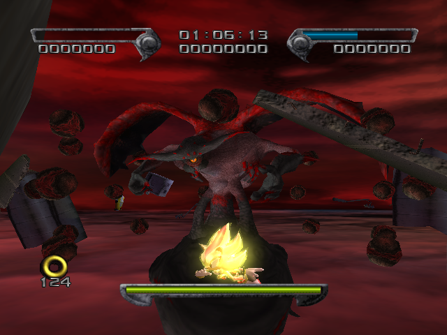 The only weak point of this boss is his eye, which alternates between the heads after being attacked. To damage the eye, Shadow can use charged or uncharged Chaos Spears, with the charged spears dealing more damage. Uncharged Chaos Spears can also be blocked by Devil Doom's wings. Shadow can attack the wings and destroy them so Devil Doom can't block attacks any more. Both attacks only work when Shadow is near him. Shadow's dark gauge can be filled by shooting city debris while the hero gauge is filled by attacking Devil Doom and the meteors around him. Chaos Blast can help with the debris, but it does not deal much damage to the eye. Chaos Control slows everything down and may come in handy but it also makes aiming more difficult.