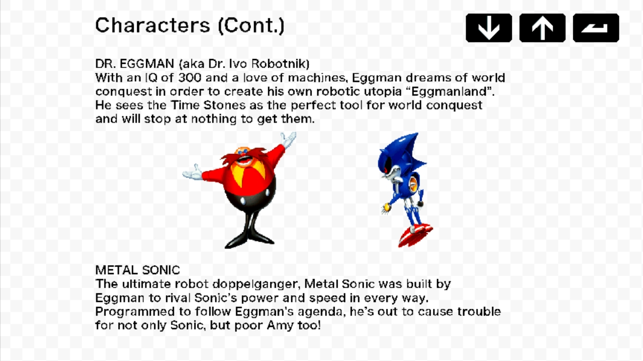 - ↑ 9.0 9.1 9.2 Sonic the Hedgehog CD (iOS) English instruction menu, "Characters (Cont.)."