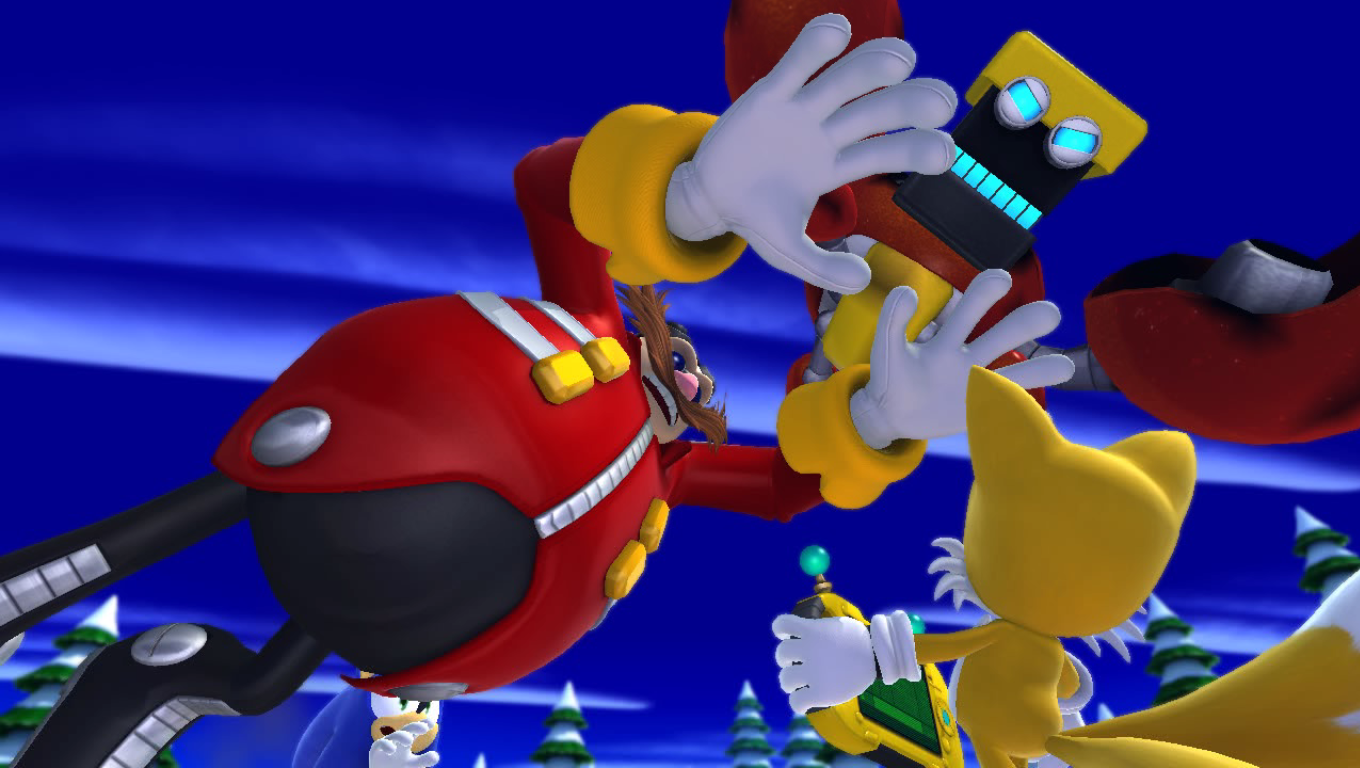 Dr. Eggman trying to save Tails from a controlled Cubot, from Sonic Lost World.