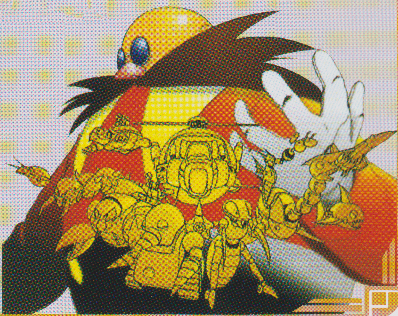 Eggman with various of his Badnik models and his trademark Egg Mobile, from Sonic the Hedgehog 2.