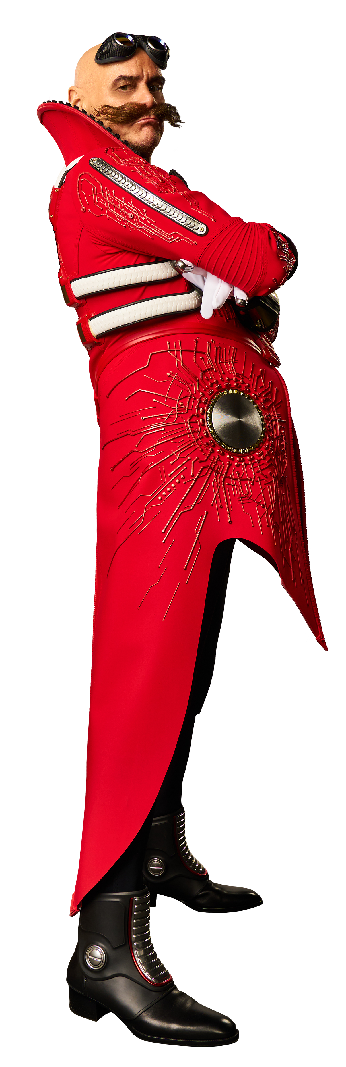 In his Modern redesign, Eggman is depicted as somewhat taller and burlier. His arms and legs have become long and almost disproportionately thin, while his mustache has become more unkempt. For attire, he retains his signature glasses and gloves but incorporates the "Egg Goggles" which sit on his forehead, although he very rarely uses them. He now dons a red coat adorned with four ingot-like golden buttons on each side of the chest, each accompanied by white straps running to additional identical buttons on the back. The coat features silver linings down the back, arms, and front, yellow cuffs, and two extensions on the front with large silver buttons. Additionally, Eggman wears black pants with matching boots, which have circular plates on both sides of the ankles and three square ones extending up the shin.