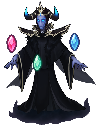 Dremagen is a sorceroress with pale blue skin, cyan eyes and a black robe with a gold trim. She has two black horns with blue tips coming out of her head. She also has three crystals floating nearby: green, red, and blue.