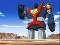Super Sweeper was giant green spacecraft-like robot. It had a large head up front resembling that of a bird's while its body was akin to that of a cargo section. On its rear it had a set of wings on the side, along with a rear wing on top, and two red rocket thrusters. Connecting its head and body was a yellow "neck" with red rims. Super Sweeper's head also had wings on its jaw, a tall yellow fin on its forehead, blue eyes, and red on the tip of its "beak".
