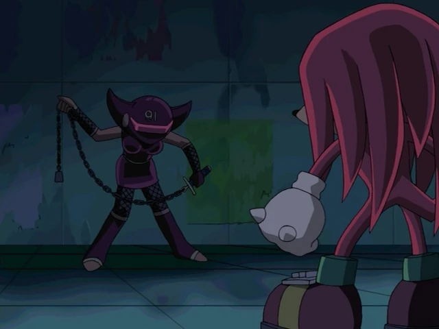 After hearing from Decoe and Bocoe that Knuckles' friend Hawk had found the fifth Chaos Emerald, Eggman deployed E-91 Lady Ninja to steal it from them. Going undercover, Lady Ninja following the duo and subdued Rouge when noticing that she was following them, before unveiling itself when the time was right and going after Emerald. The ensuing battle made the subway they were in collapse, forcing Lady Ninja to retreat without the Chaos Emerald. When Knuckles later went to retrieve the Chaos Emerald, Lady Ninja kidnapped Hawk and held him for ransom, demanding Knuckles meet it later for the exchange. When the time came for the trade though, Rouge interfered, which led to a chase throughout the city for the Emerald. Eventually, Lady Ninja ended up subduing Knuckles until Hawk managed to short-circuit it, thus allowing Knuckles to sent it flying with a powerful punch.[17]