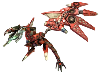 The Egg-Wyvern is a large robot that is similar to the creature of the same name: a breed of giant dragon native to Africa. It is completely red with spots of silver, white, and black here and there. Its lower jaw is the Egg Mobile serving as the cockpit that is simply attached to the robot's neck.[1]