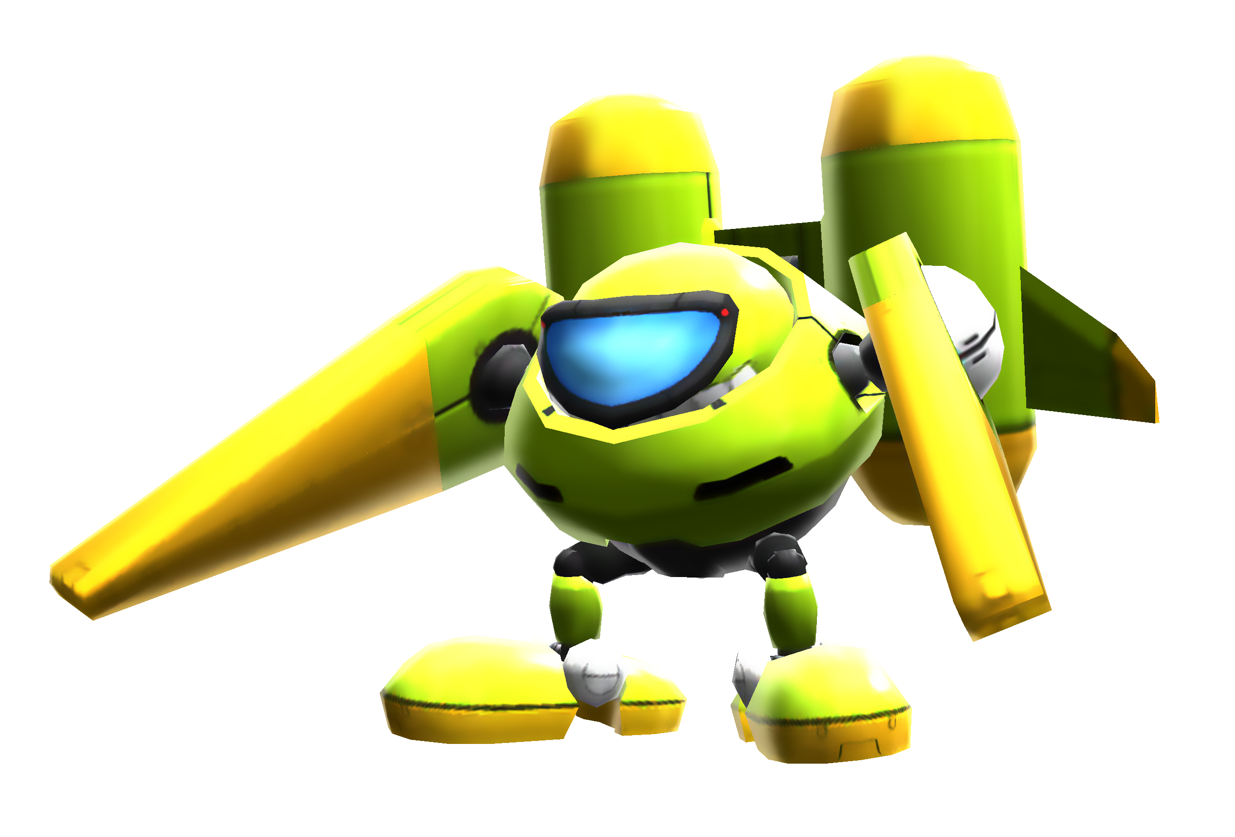 In Sonic Colors , the Egg Chasers closely resemble green and yellow Egg Pawns . They have ball-shaped torsos with a hemisphere on top of them that act as their heads. They also wear blue, single-lensed goggles over their eyes. They also have large feet with short legs and their laser turrets are built into their triangular wing-like arms. On their backs, they have large cylinder-shaped jetpacks. They are also all colored lime and have black underbellies.