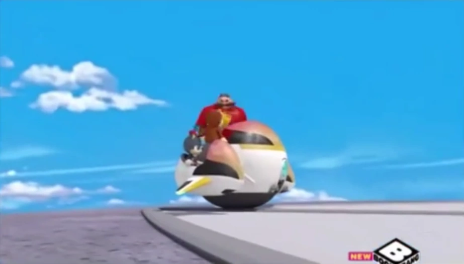 On a day of battling Sonic, Eggman tried escaping in his Eggmobile until he sicced Burnbot at Sonic. When Burnbot was defeated, Eggman had his Eggmobile haul Burnbot back home. Later, as Eggman raced against Tails and the Tornado during Sonic's sidekick try-outs with his Eggmobile, he used it to pull in Burnbot who made Tails crash. However, after Sonic helped beat Burnbot, Eggman fled in his Eggmobile.[3] When Obliterator Bot later went rampant and trashed his fortress, Eggman used his Eggmobile to follow Team Sonic there after recruiting their help.[24]