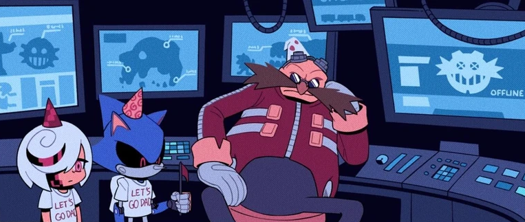 Eventually, Dr. Starline, Surge and Kit invaded Eggperial City. As the local Badniks tried defending the city from the invaders, Orbot and Cubot returned to Dr. Eggman after taking a leave of absence for a while. Eventually catching the duo sneaking into his headquarters, Eggman took no interest in where they had been and ordered them to monitor Surge and Kit, who were wreaking havoc around Eggperial City. Eggman eventually sent Metal Sonic after the duo, but Surge and Kit managed to defeat the robot. Eggman then detected Starline's presence in his server room. There, Starline uploaded an override program that gave him control of all the Badniks in the world. As his own robots tried to apprehend him however, Eggman escaped through a chute to his Memorial Garage, where he chose one of his old machines to launch a counterattack with. Meanwhile, Starline was led to Eggperial City's headquarters, where he took Eggman's throne and ordered his signal to be broadcast all over Eggnet in order to assemble all the world's Badniks in Eggperial City, which he knew would lure Sonic to the city. Meanwhile, Surge and Kit plotted to betray Starline by exterminating not only Sonic and Tails, but also Starline, Eggman, all of their allies, and everything that both the villains and heroes stood for.[2]