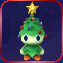 Evergreen Chao have pale green pudding-like bodies with round, waterdrop-like heads. They also have large eyes, no noses or mouths, round torsos that are smaller than their heads, smooth feet with no legs, and arms with no visible hands. In addition, neither their arms nor feet have digits. They also have a short and round tail, and a small set of wings on their backs. For attire, they wear a two-part Christmas tree outfit. The lower part covers their whole torso and looks like an undecorated evergreen tree. The top part, which they wear on their head, has red and blue ornaments on it as well as a start on the top, and it is also slightly more conical in shape than the part of the costume on their torso.