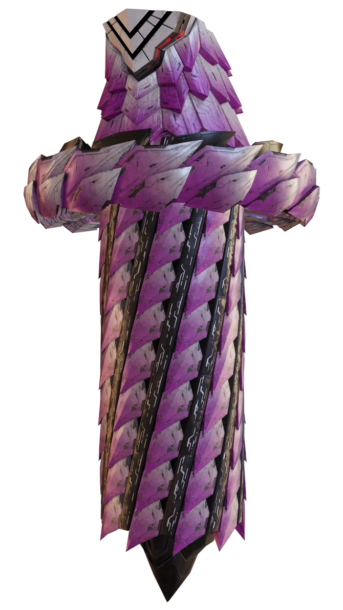 The Excavator is a robotic enemy composed of various stacked parts, with multiple cylindrical segments, a head, and a spiked base. Its "body" segments are covered in metal pink, scale-like armor plates which can fan outward when the robot moves or suffers damage. Its head segment has similar "scales" as its body, but with the addition of a sloped purplish plate with grooves evoking a simple face. Its base is a metallic spike which is usually buried in the ground, only being revealed when the Excavator moves around. Finally, it has a thick black ring of scaled metal around its body, which can freely move along any of its body segments.