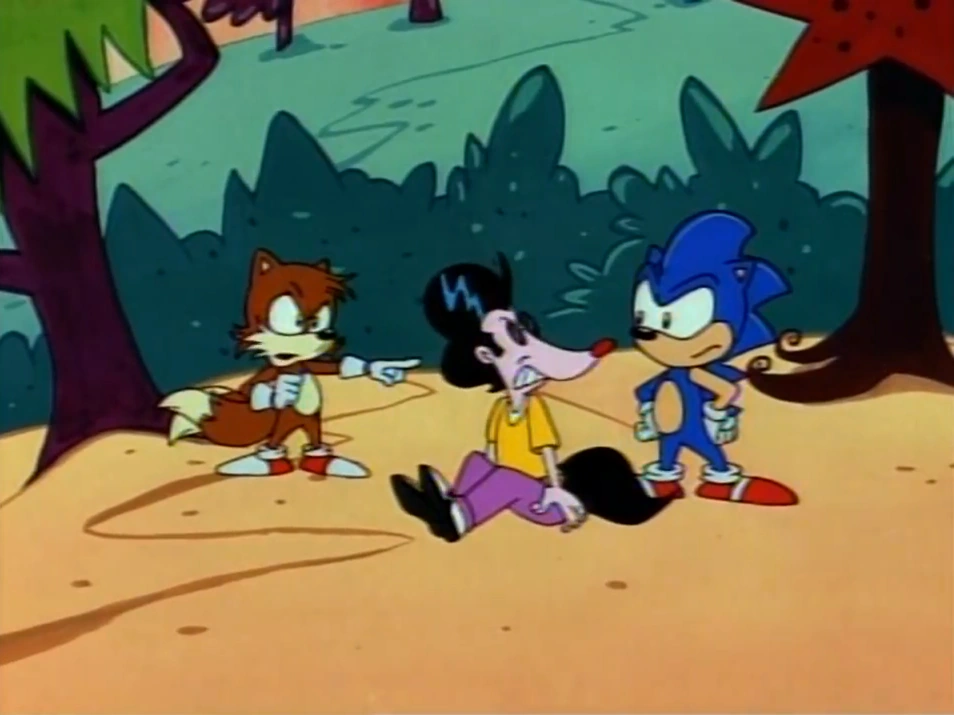 Sonic and Tails spot Scratch and Grounder setting a trap. Sonic confronts the Badniks, but they tell him the trap is not for him and want him to go away. Curious, Sonic and Tails spy on the bots until they catch their prey. Sonic immediately rescues the victim who he soon learns that Easy Eddie is a bully and pickpocketing ferret.