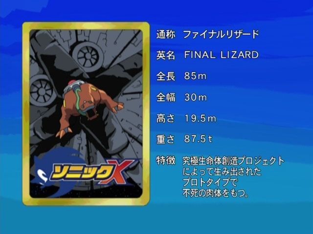 The Final Lizard (ファイナルリザード Fainarurizādo?)[1] is a transformation that appears in the Sonic X anime series. It is the Bio Lizard, having transformed by fusing with the Space Colony ARK. When Sonic the Hedgehog and his allies stopped the Space Colony ARK from colliding with the Earth on its own, the Bio Lizard merged with the ARK to become Final Lizard and keep it on its crash course. However, he was destroyed by Super Sonic and Super Shadow.