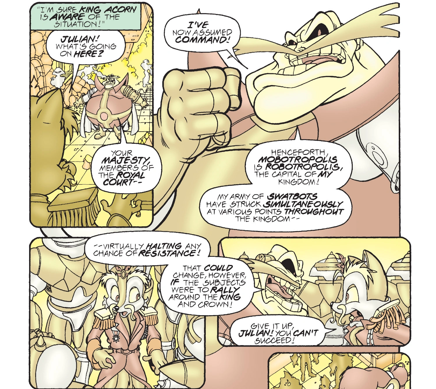 In the aftermath of the Great War, King Maximillian Acorn made the decision to dismantle the War Ministry and to appoint Julian Kintobor (The future Dr. Robotnik) as Minister of Science. Unknown to Max, Julian secretly planned to overthrow him. At first, Julian planned to use an army of cyborgs to take control of the Kingdom of Acorn but his only successful subject was Monkey Khan, for the rest had died. To remedy this mistake, Julian sabotaged the original Roboticizer and forced Sir Charles Hedgehog to give him the device. With his plan formed, Julian enlisted the aid of his nephew Snively and prepared to take control of the kingdom.[1][2][3][4]