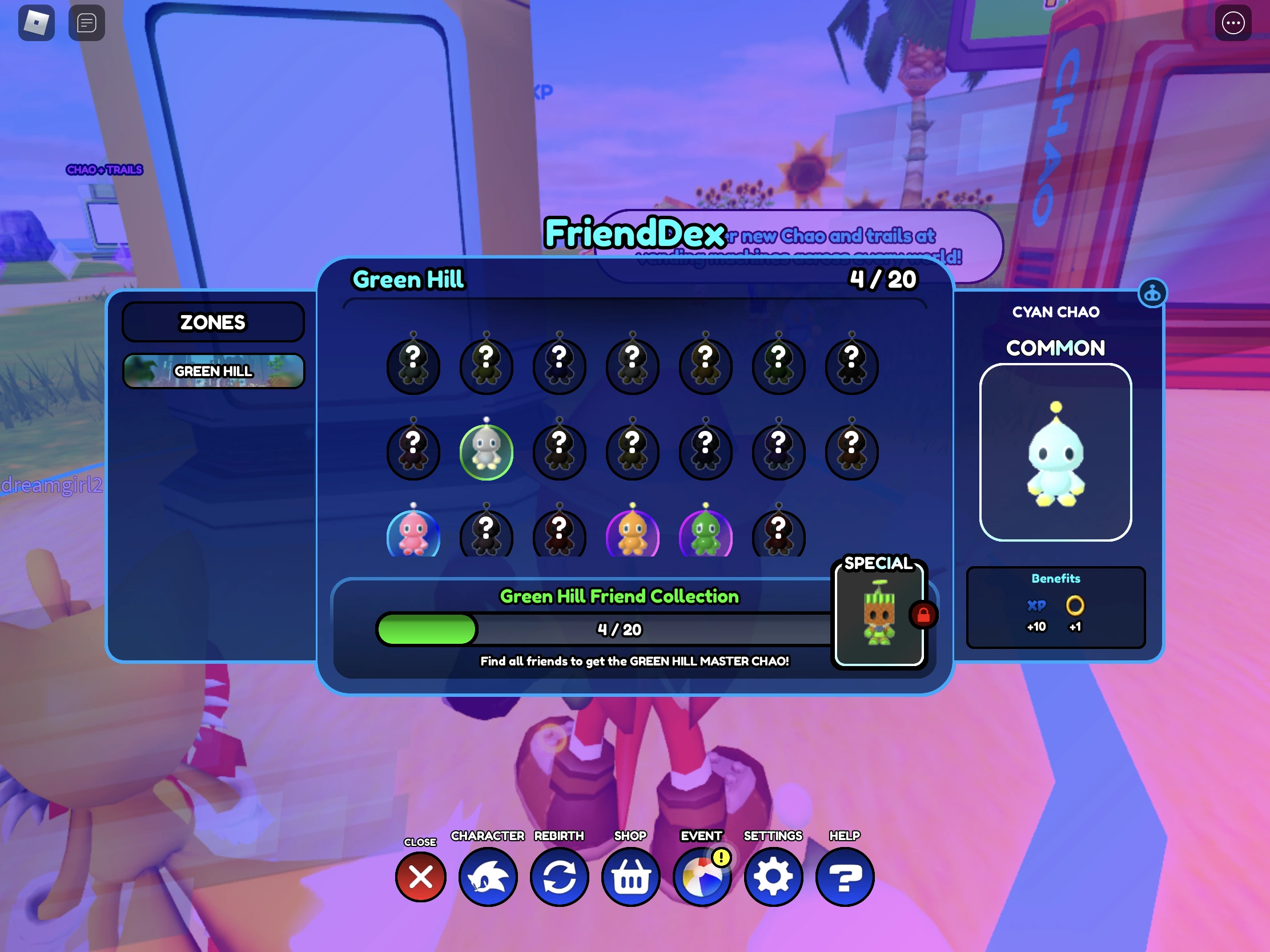In gameplay, the FriendDex is used to keep track of all the the Chao native to Green Hill that the player has collected over the course of the game. When opening a FriendDex, the player can check an index on how many Chao of the different Chao they have collected from Green Hill, and how close they are to unlocking the designated Green Hill Master Chao . Notably, the player does not need to have one of these Chao in their possession; as long as they have held one of the required Chao at one point, then the FriendDex will register that Chao in its index. If they player gets all twenty of the required Chao from Green Hill, they will unlock the Green Hill Master Chao at the FriendDex.