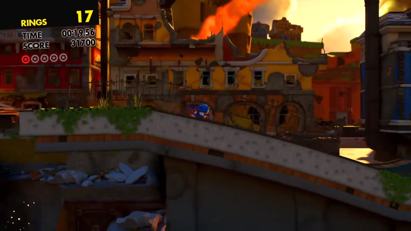 Just before the first Star Post, there is an upper path that leads over much of the terrain. Should the player choose the pathway the Star Post is on however, they will pass through the sewers. Regardless, both paths will rejoin just before a corkscrew, passing right in front of a mass-produced Death Egg Robot who watches Classic Sonic pass as others can be seen in the background tearing the City apart with stomps or their extendable arms with spiked fingers, swinging them wildly with the occasional lunge into the ground as they ravage the landscape.
