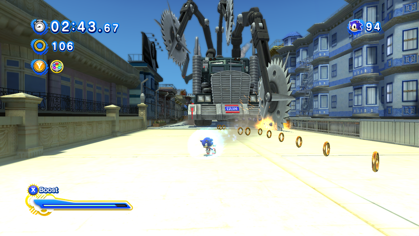 In the console/PC and Nintendo 3DS versions of Sonic Generations, an incarnation of Central City from somewhere in spacetime got transported to White Space where it was drained of color and life. When Classic and Modern Sonic went through this area, both would encounter various of G.U.N.'s robots, Blue Eagles, as well as an improved G.U.N. Military Truck.