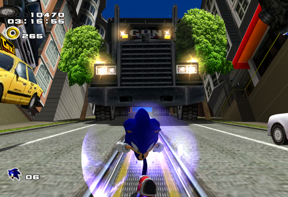 Sonic escaping from a G.U.N. Military Truck, from Sonic Adventure 2: Battle.