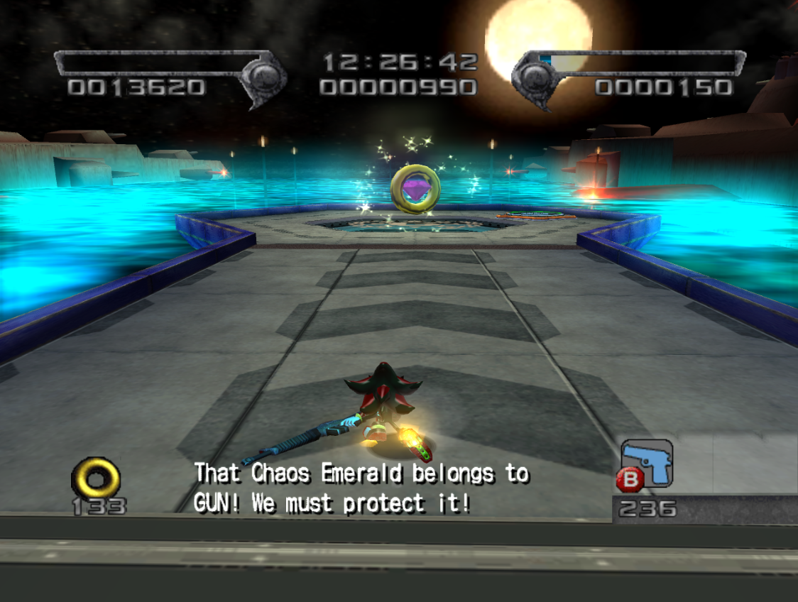 - ↑ Sonic Team USA (June 23, 2001). Sonic Adventure 2. Dreamcast. Sega. Area/level: Radical Highway. "Shadow: I took the Chaos Emerald from the national reserve bank. And now the military and police are chasing me. I don't care if they know who I am because they'll never catch me. It's just a waste of time! There's no time for games. I have to get out of here, fast!"