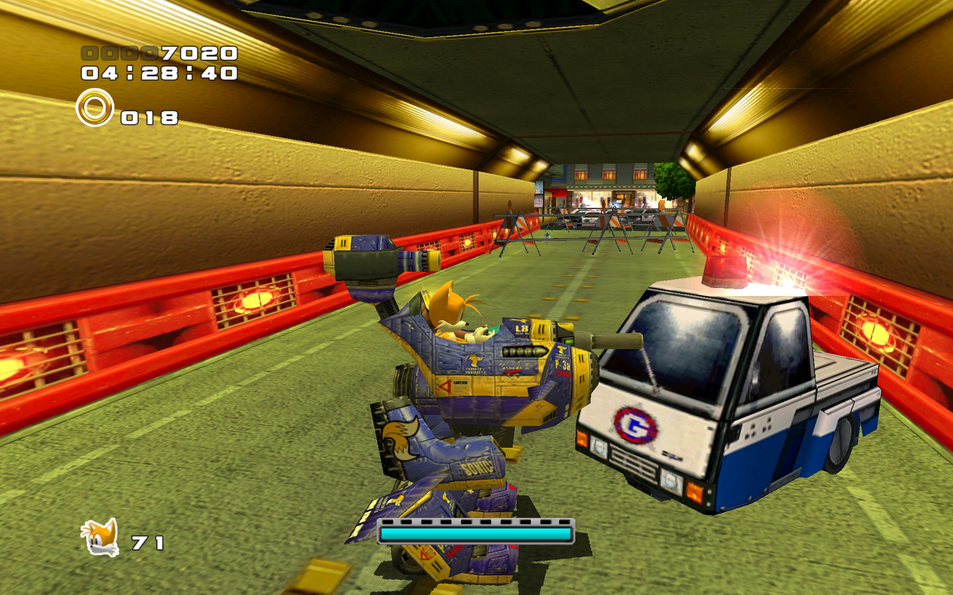 Mistaking Shadow for Sonic the Hedgehog, G.U.N. found the latter the next day. Seeing him as a deserter from the military facility, they caught him and were about to take him to Prison Island. However, when the Sigma-Alpha 2 helicopter containing Sonic was flying over Central City, the rather rebellious hero broke out and fell into the city down below, where he evaded the various troops hot on his heels.[11] Eventually, G.U.N. sent out their one of their massive military trucks to chase after the hedgehog, but this mission was unsuccessful. That night, Shadow stole a Chaos Emerald from the national reserve bank and ran through the capital city while the military was hot on his heels.[12] Meanwhile, the armed forces had a F-6t Big Foot mech attempt to defeat Sonic, but they saw little success. However, when the blue hedgehog met the black hedgehog soon after and the latter left using Chaos Control, G.U.N. finally caught the hero and imprisoned him on Prison Island.