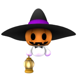 Halloween Chao have white pudding-like bodies with a carved pumpkin for a head. They also have large eyes, no noses or mouths, round torsos that are smaller than their heads, no legs or feet, and arms with no visible hands. In addition, their arms don't have digits. They also have light purple tips on their arms and a short and round tail. For attire, they wear a wide brimmed black witch hat with a purple band, and a black cape. Additionally, they hold a brass lantern in their right hand.